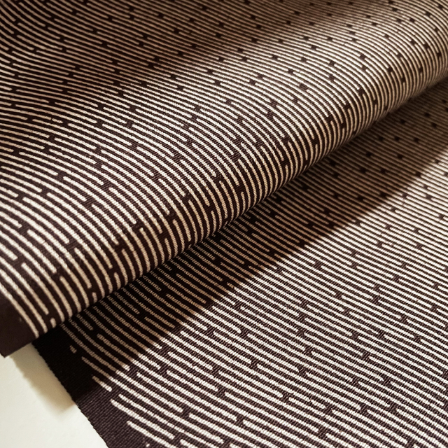 また、滑らかによろけた縞は、お召しになると軟らかく優しい雰囲気で包み込んでくれます。縞は直線ばかりではありません。こうした職人たちの洒落心と技が生み出した縞もお楽しみいただきたいと思います。