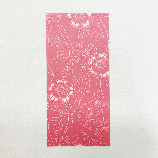オリジナルデザインの着物や浴衣に使われてきた意匠…、そして今では復刻が出来ない貴重な型紙の中からも厳選し、裏面にプリントしています。こちらは『さくら』。中には「桜唐草」「鉄線散らし」「露芝風秋艸の霞取」「桜花亀甲の籠目取り」の4柄。