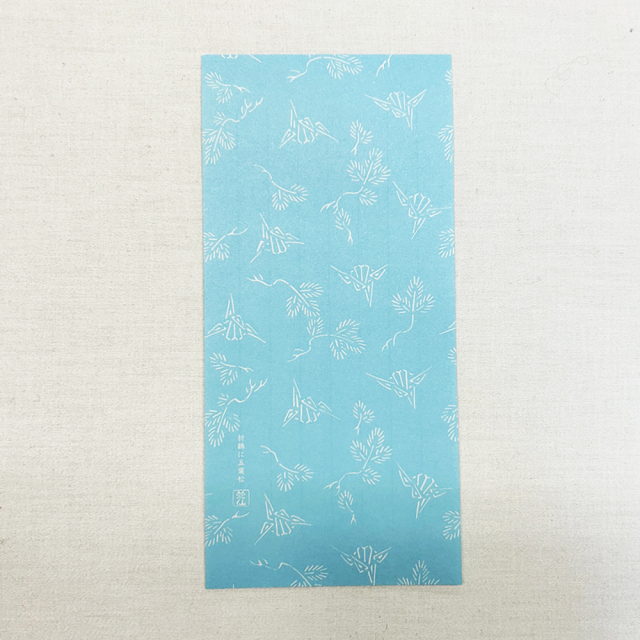 オリジナルデザインの着物や浴衣に使われてきた意匠…、そして今では復刻が出来ない貴重な型紙の中からも厳選し、裏面にプリントしています。こちらは『藍紫色』。中には「折鶴に五葉松」「立縞水仙」「麻の葉に雀の松皮どり」「萩の丸」の4柄。