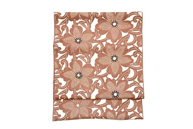 薄いクリーム地にココア色で染め上げた越後型染名古屋帯です。