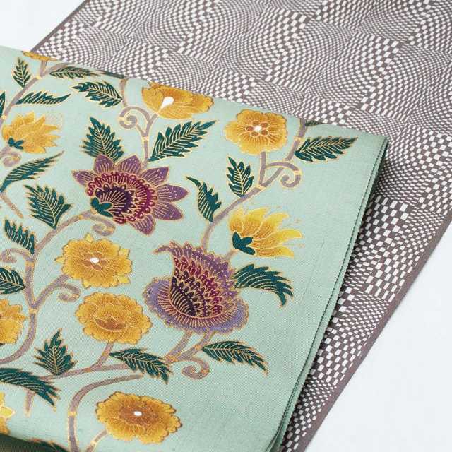 お太鼓いっぱいに広がった花、蔓、葉。描かれているのは洋の花なのですが、色使いで和の味わいを感じさせる帯になっています。 前柄は右手と左手でお召しになったとき柄の出方が変わります。
