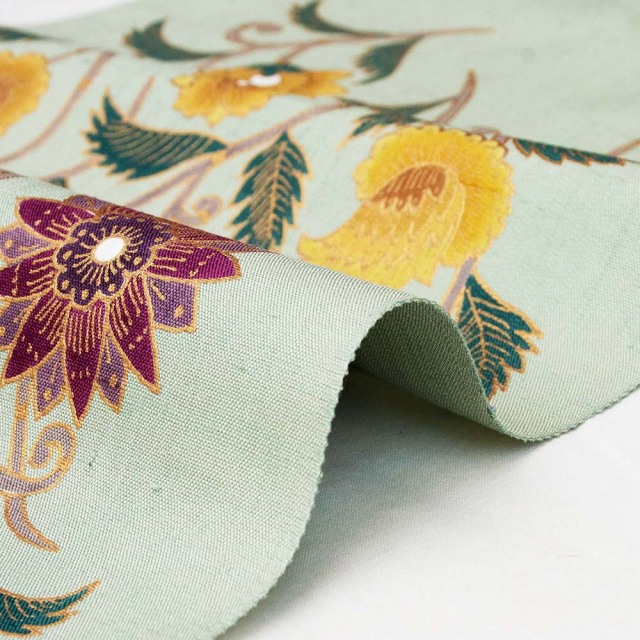 紬地に青磁色の地色を施し、辛子色や深紫の濃淡で色差しされた