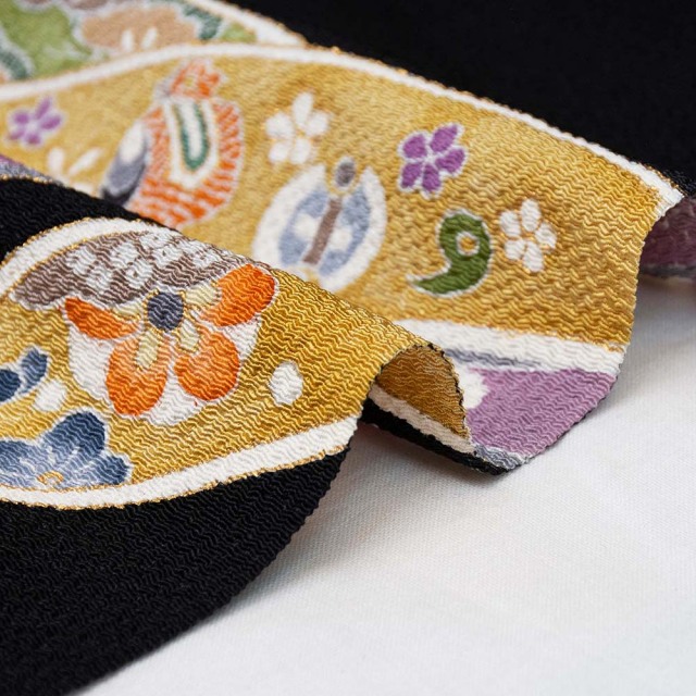 見ていて飽きることがない人気の宝尽くしの柄。落ち着いた色で色差しされた吉祥模様も描かれて、さりげないフォーマル感が絶妙です。 柄が片寄に配されているので地色の黒も美しく着物を引き立てます。