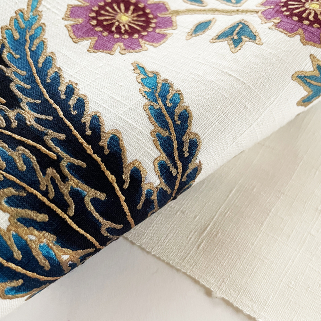 ろうけつで柄縁を防染し、手描きで色を差して描いています。金泥で括りを施しています