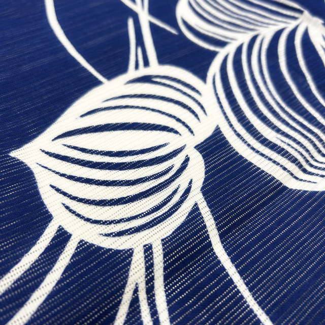 それによりモワレのような独特の風合いが生まれ、実際にお召しいただくと、爽やかで涼しげな印象を与えます。この綿絽の生地は戦後、正絹の七五三絽を模して、木綿で織り上げました。ところが短繊維の木綿では七五三をきれいに織れず、多少不揃いが生じましたが、それが返って自然な涼しさを醸し出し、それ以来この生地を使用しております。
