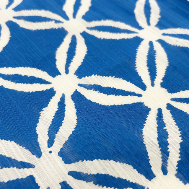 かげろうゆかたの中でも人気のブルー。丸いラインの七宝の柄が雰囲気を可愛らしく表現され、柄の部分は抜染という技法で色を抜いているのでほんのりとベージュがかって優しい印象です。