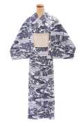 墨黒の麻半巾帯で色のトーンを合わせ青の三分紐と蜻蛉玉できりっと仕上げました。※こちらの商品は反物のみで、帯は別売りです。