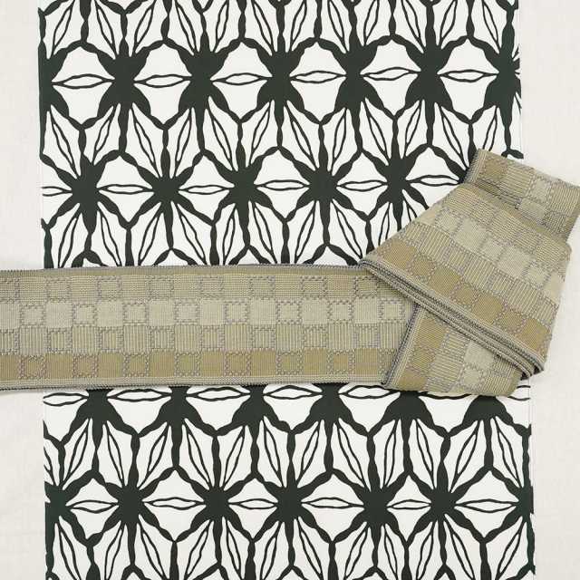 変わり色のグリーンに馴染む、落ち着いているけれど渋すぎない色味の道屯花織帯をコーディネート。
