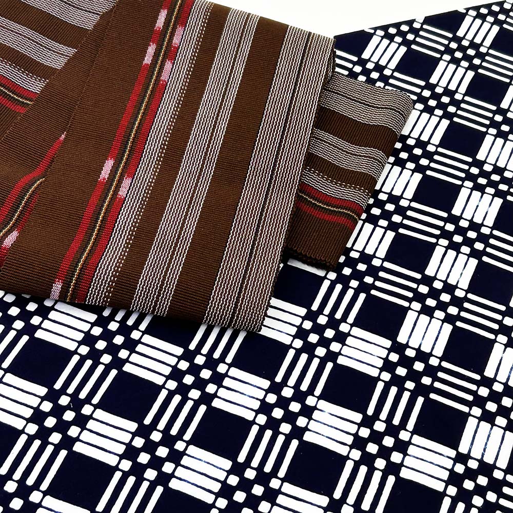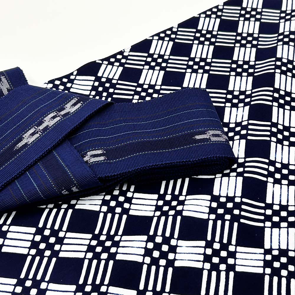 華やかに見える格子柄なので少し締めるイメージで帯合わせをしてみました。男帯は紺をベースにした琉球絣、女帯は焦げ茶と赤が利いた琉球がすりの半巾帯です。
