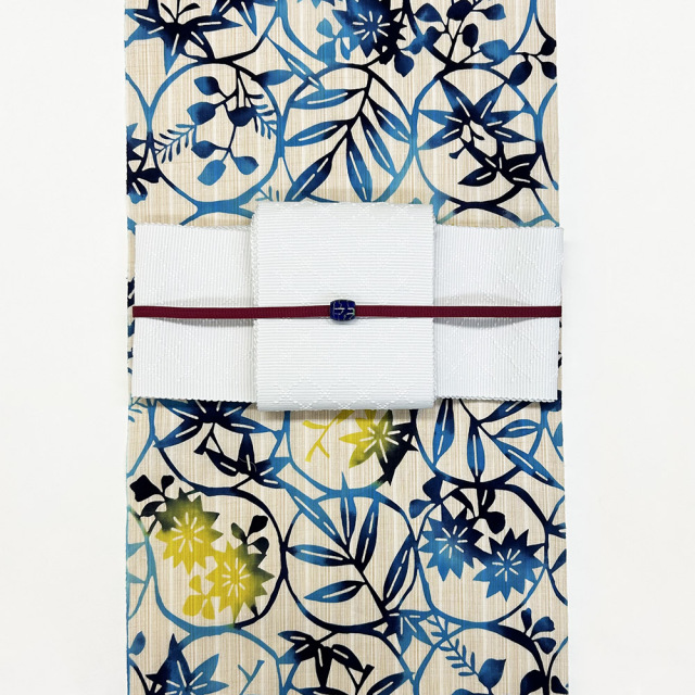半巾帯のコーデは白×グレーの花織のシンプルなものを合わせてすっきりと軽やかな印象にしてみました。男帯は、琉球絣の二本飛び絣といわれる柄のものでキリッと。
