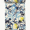 様々な草花を描いた絵に、ラフな丸印でかこったような一風変わった意匠です。染める色によってその印象は民芸風に見えたり、スタイリッシュに見えたりと様々です。こちらは、きつくなりがちな青と黄色の濃淡を茶紬の生地色がほどよく馴染ませてくれて、北欧風なモダンな雰囲気に仕上がっています。お召しになった印象も男女でそれぞれに変わってくるのでペアで楽しむのよいのではないでしょうか。
