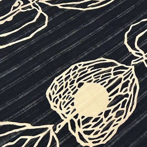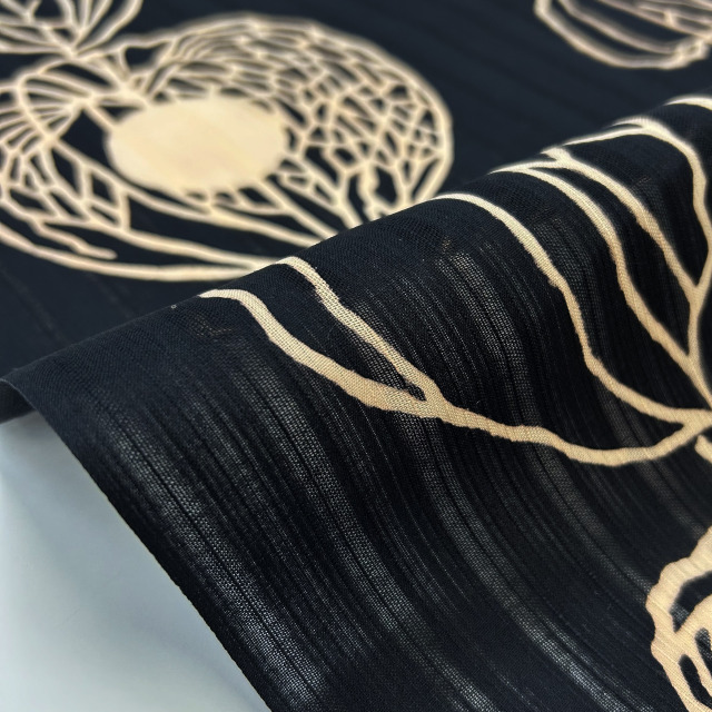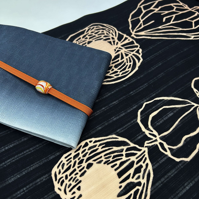黒地に少し赤みがかったベージュのコントラストがなんともいえないニュアンスなかげろうゆかた。この色は、別色で染めたものでも生地の色でもありません。最初に黒に染めて抜染という注染の技法で、柄を出したものです。大胆に図案化したほおずきが印象的。年齢問わず、ユニセックスでお召しいただきたい一反です。