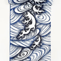 波をモチーフにした意匠は様々ありますが、寄せては返す波は果てることがないことから、永遠や不滅、長寿、誕生等を意味する吉祥文様とされています。こちらは立体的に渦巻く波から波頭が立つとても勢いのある躍動感のある柄です。白地の綿絽によく合って、夏の潮騒が聴こえてきそうです。着姿を華やかに彩ります。