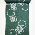 紬ゆかたの魅力は、なんといっても染ることでニュアンスや奥行きが感じられるその生地感。こちらは、無地場が多めなのでその魅力が存分に味わえる一反です。柄は鉄線で文字通り鉄のように強靭な蔓を持つことから、夫婦円満、縁結び、延命長寿等を表すといわれる吉祥文様。蔓は輪のように図案化しポップな印象に仕上げています。グレーに先染めした生地を、グリーンに染めてから抜染した手のかかった仕事の紬ゆかたです。