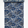 モチーフは桐と桜。そしてそれらを繋ぐように唐草が配されいい仕事をしています。桐と桜に施された濃い色も一つひとつを丁寧にアクセントを変えて差しているので、表情を豊かにみています。浴衣としてすっきりとお召しになるもよし、衿を入れて木綿の着物風にお召しになるもよし。花冷えの季節、梅雨冷えのお出掛けなどにお洒落浴衣として活躍してくれることと思いますので、長く楽しめる一反です。
