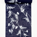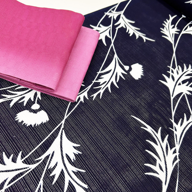 あざみには鋭い棘があることから、悪いものを寄せ付けないものの象徴として、魔除けや厄除けを願う人々から好まれたため、着物や浴衣の意匠として親しまれてきました。こちらの浴衣は、あざみを斜めに配して、茎と葉が伸び伸びとしつつも流れを作っているので、着姿がとても優しげですっきり見えます。そして所々に開いた花がちょうどいいアクセントになっています。華やかさとはまた違った凛とした印象の一着です。