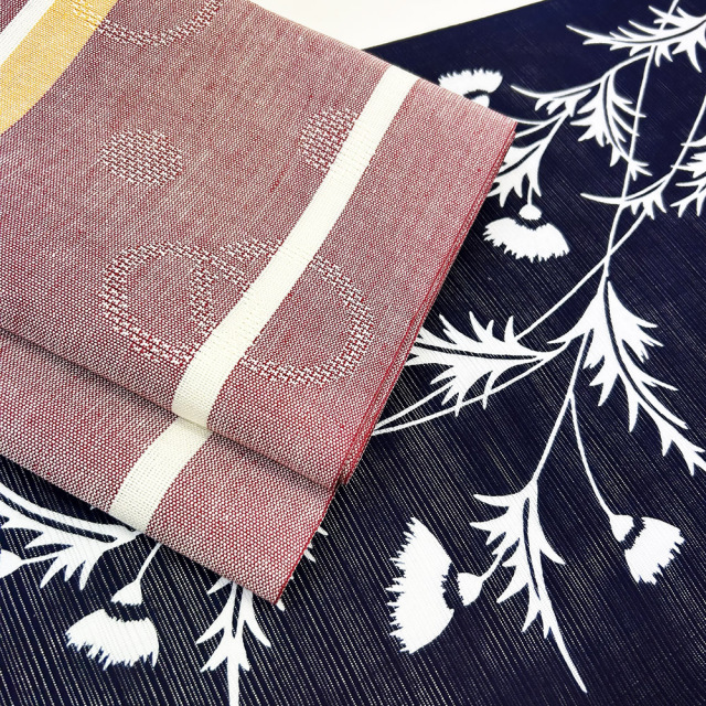半巾スタイルは紺地に映えるワイン色のぼかしの麻市松で華やかさを添えて。丸紋の入った赤×黄色の麻織り八寸帯で少し大人カワイイお太鼓スタイルにしてみました。