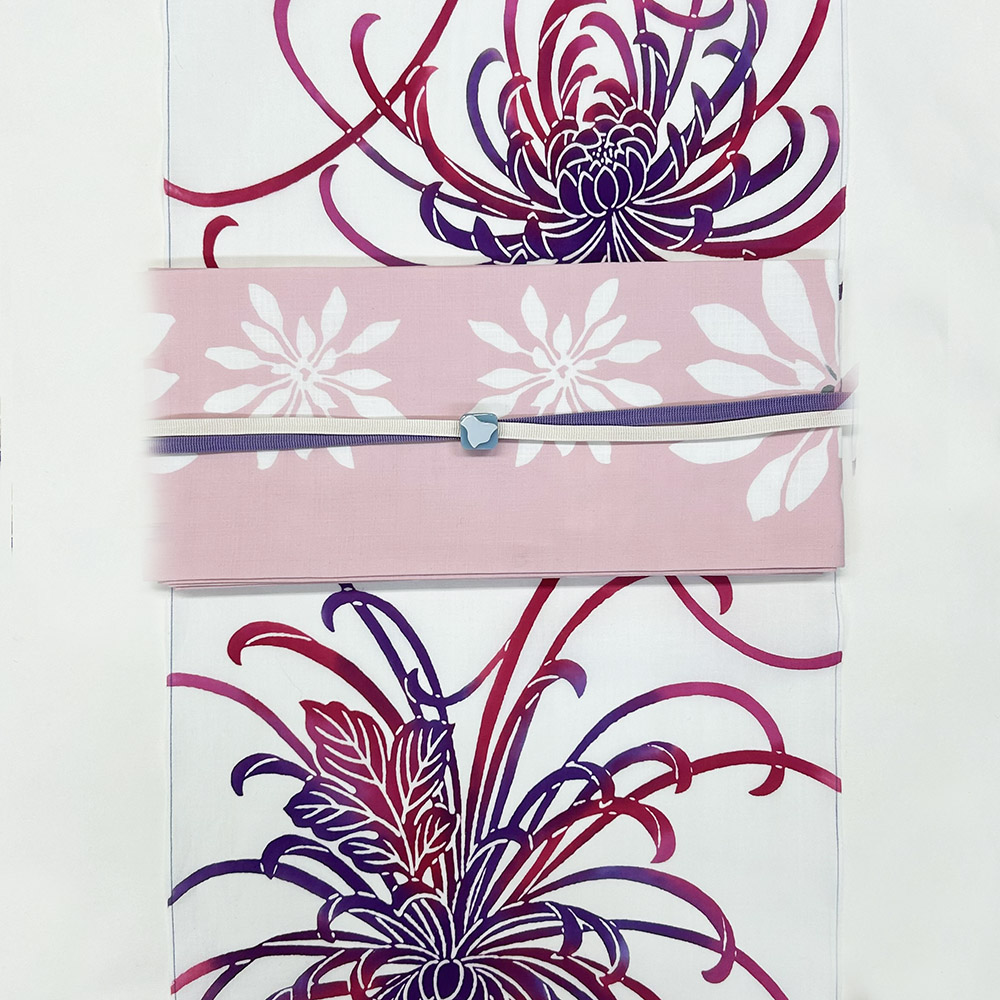 華やかな色の柄に映えるリバーシルで使えるパープル×生成の麻半幅帯を。もう一点は、薄いピンク色の花柄の半幅帯に、三分紐と帯留でアクセントをつけました。