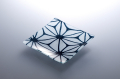 その名の通り、皿縁が漣のようにゆったりと波打つ水面のようなデザインになっております。ガラスに挟んだ生地の種類によって、透け感や光沢の味わいが多彩に変化するのもこのシリーズの特徴です。こちらは綿絽白地の麻の葉を挟み込んでいます。テーブルウエアとしてだけでなく、アクセサリーを置いたりなど自由な発想でお使いいただければと思います。