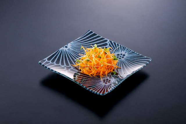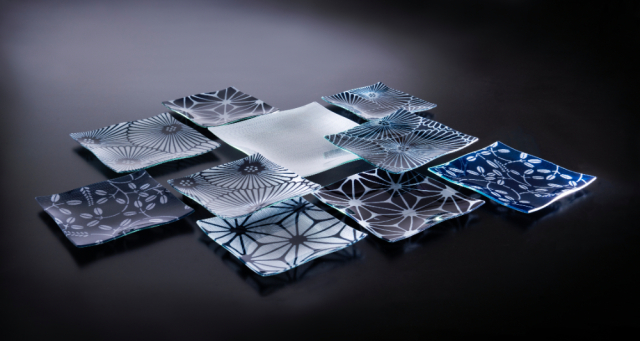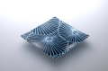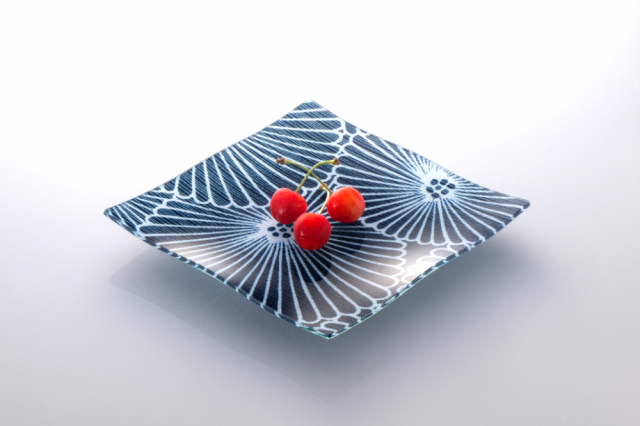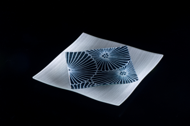 その名の通り、皿縁が漣のようにゆったりと波打つ水面のようなデザインになっております。ガラスに挟んだ生地の種類によって、透け感や光沢の味わいが多彩に変化するのもこのシリーズの特徴です。こちらは綿絽地染の万寿菊を挟み込んでいます。テーブルウエアとしてだけでなく、アクセサリーを置いたりなど自由な発想でお使いいただければと思います。