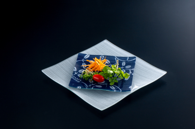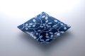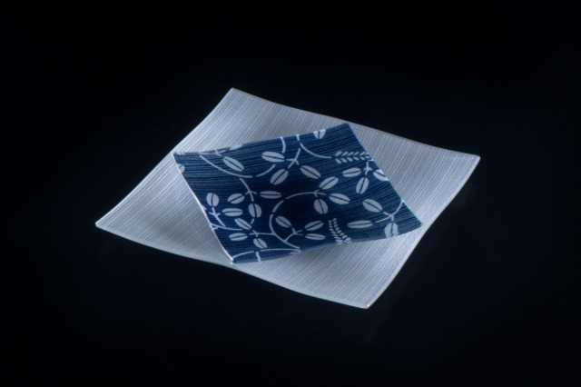 『漣17』(H1.8㎝×W17㎝×D17㎝)。その名の通り、皿縁が漣のようにゆったりと波打つ水面のようなデザインになっております。ガラスに挟んだ生地の種類によって、透け感や光沢の味わいが多彩に変化するのもこのシリーズの特徴です。こちらは綿絽地染の萩を挟み込んでいます。テーブルウエアとしてだけでなく、アクセサリーを置いたりなど自由な発想でお使いいただければと思います。