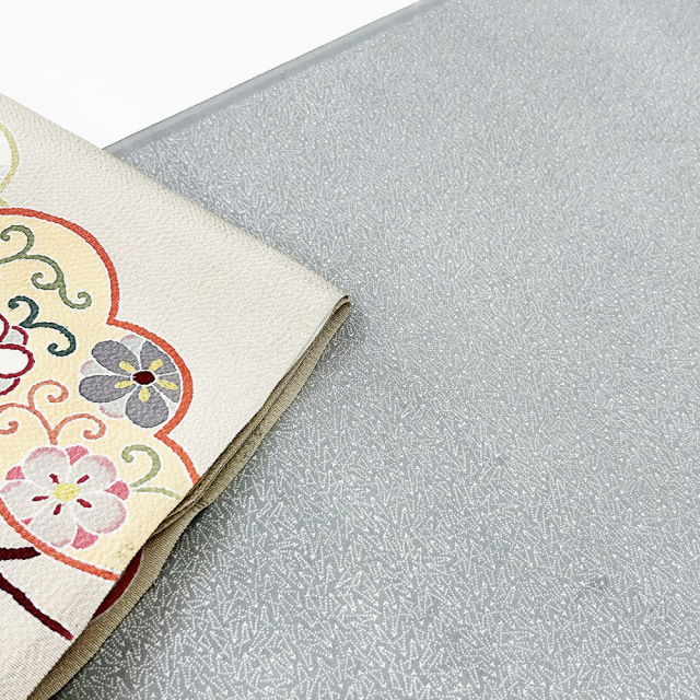松は吉祥を象徴する文様として親しまれ、季節を問わず一年を通してお召しいただける柄。こちらは初雪を思わせる銀鼠色に染められており、凛とした中にやわらかな明るさがあります。お顔映りもすっきりと美しく見せてくれる一枚です。