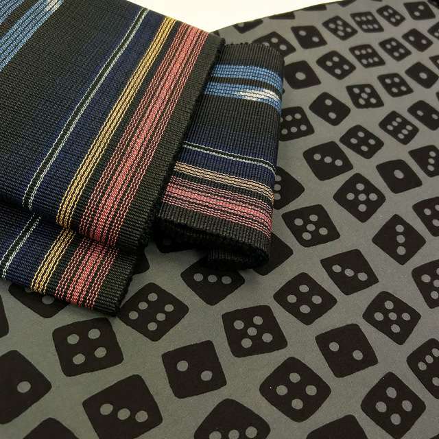 きれいな青の濃淡がお洒落感を増す二本飛絣の男帯は白のラインが全体を上手くまとめてくれます。半巾帯は黒地に配色が絶妙な琉球絣で洋服感覚の帯合わせです。