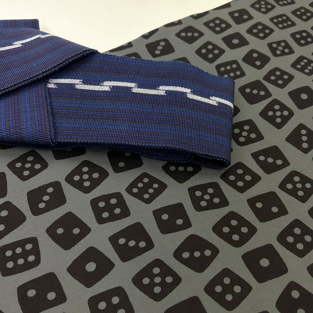いい目が出ますようにとの江戸らしい洒落のきいた賽の目の意匠は、整然と並んでいないところにどことなく愛嬌があり、遊び心を感じさせます。賽の目の並びが動きを出していて、目には格子のようにもみえますが印象を優しくしています。ブルーがかったグレーで地色を染めて、その上に賽の目柄を更に染めた手のこんだ浴衣です。キングサイズなので長身の女性にもお楽しみいただければと思います。