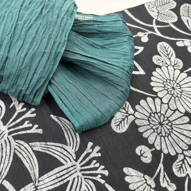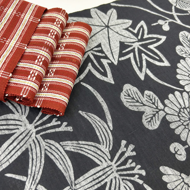 墨黒を重たく見せないようなコーディネートを2種。グリーンの麻の兵児帯で表情を楽しんだり、赤の花織の半巾帯で大人の甘さとカラー使いを楽しんではいかがでしょう。